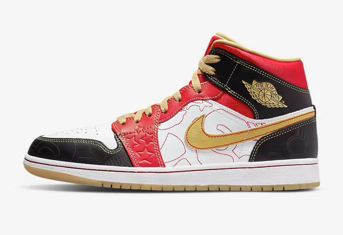 Air Jordan 1 XQ 最初于 2007 年在中国独家发售,货量极少,仅有 240 双。随后在 2013 年在上海再次发售,货量也仅有不到 1000 双,由此可见其稀有程度。为庆祝进入中国第 25 个年头,Jordan Brand 迎来纪念活动的重头戏,将曾经超限量的「喜庆」 Air Jordan 1 重塑带回。鞋身整体采用象征喜庆气氛的红、金华丽装扮示人。前掌两侧则辅以细腻皮革压印五星元素点缀。鞋侧白色部分暗藏的金线刺绣图腾,源自中国传统的舞狮剪影。鞋帮经典飞翼 Logo 与 Swoosh 注入烫金元素。后跟部位则还原类似缎面材质,并以皮革内衬包裹,展现出众质感。鞋身黑色部分保留当年顶级鞋款才拥有的镭射工艺。将飞翼标志与篮球等几何图形共同呈现,相比于此前版本,镭射花纹更明显,视觉层次也更突出。整体无论是材质的丰富程度,还是细节的刻画方式,都称得上是今年 Air Jordan 1 家族中一顶一的豪华规格。