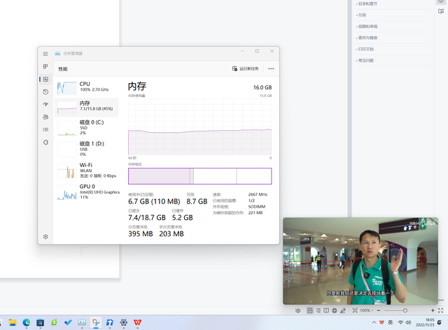 适配环境这里我模拟轻办公,同时开启Edge浏览器播放B站视频+腾讯文档+微信+WPS后内存实际使用量也才6.7G,当然CPU已经满载,剩下的9G多内存浪费了,如果是酷睿级别常规笔记本,16G容量才能最大程度发挥CPU性能。