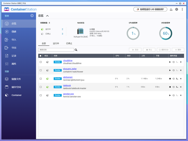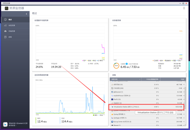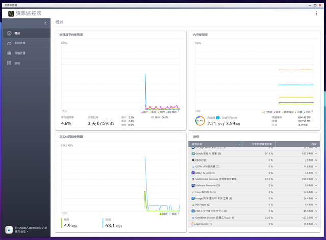 下图是开机很久的TS-264C测试机,上述常规服务(看右下统计)都启用外加开了Qbittorrent等少量Docker项目也就用了2.21G,CPU利用率也只是在4.6%,所以对威联通QTS系统来说8G容量已经很富裕了。