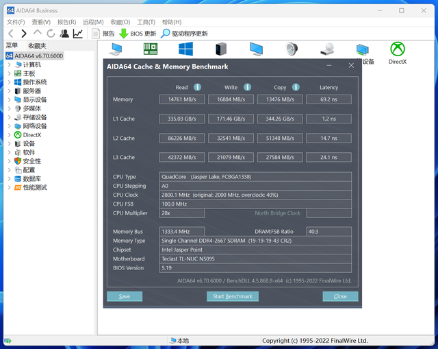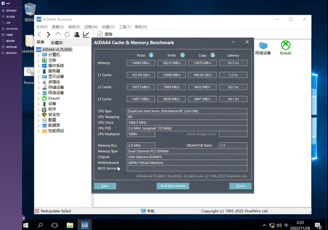 将AIDA64复制到虚拟机中,重跑内存性能测试: