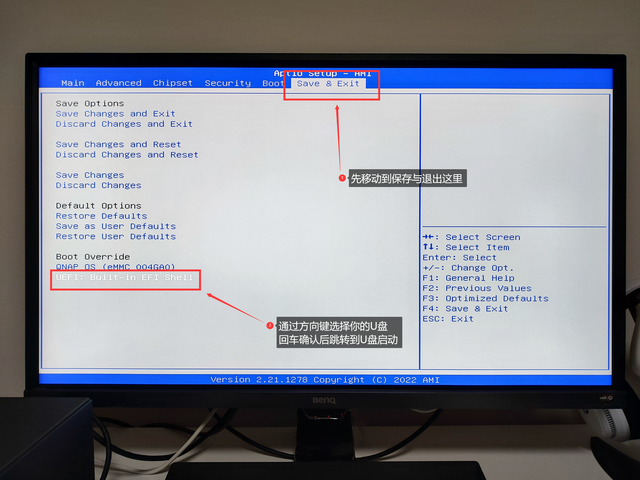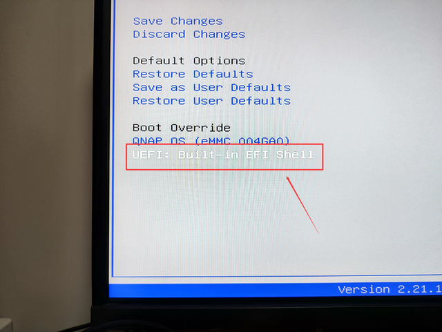 第二步,用键盘↓键,移动到BootOverride这里,找到UEFI开头的Ventoy引导盘,直接回车会开始从U盘引导,名字可能不一样,不是QnapOS开头的那个就是了。