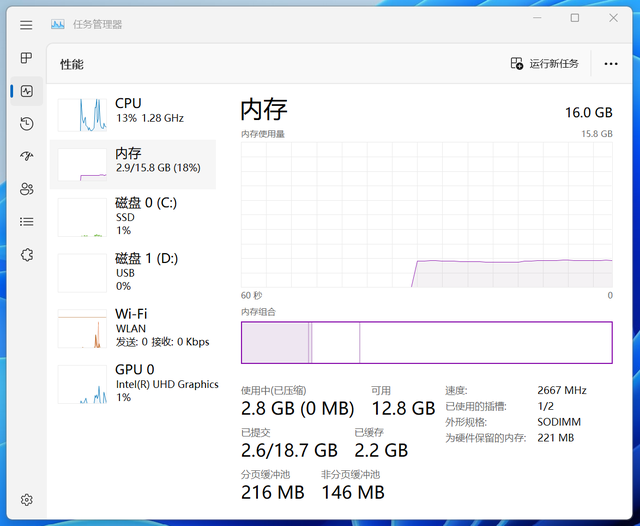 无任务运行的空载待机状态下,Windows本身要吃掉2.8G左右的内存容量用于系统运行,也就是说去掉核显吃掉的0.2G,还有13G的可用容量。