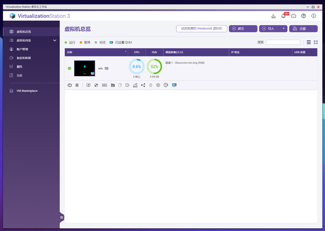 除了威联通自研套件和Docker项目以外,还有些用户可能会创建Windows虚拟机挂一些只能在win下使用的项目,这里用VirtualizationStation3创建一个Win10虚拟机作为测试。