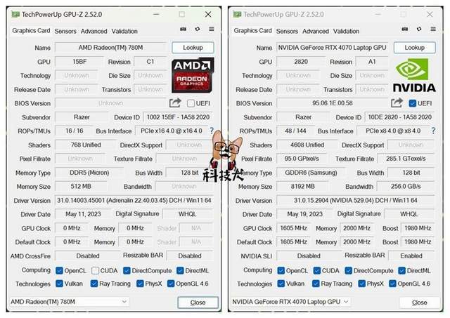 具体来看,科技犬所测试新款灵刃14(在图形方面使用英伟达GeForce RTX 4070 Laptop GPU,显存为8GB GDDR6 VRAM,位宽128bit,核心频率1605MHz、显存频率2000MHz、Boost频率1980MHz。