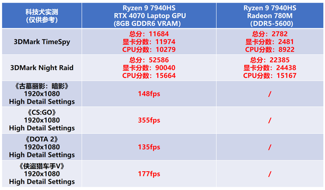 通过一张表格来快速了解新款灵刃14搭载的搭载GeForce RTX 4070 Laptop GPU和Radeon 780M GPU的性能及游戏表现,具体如下图: