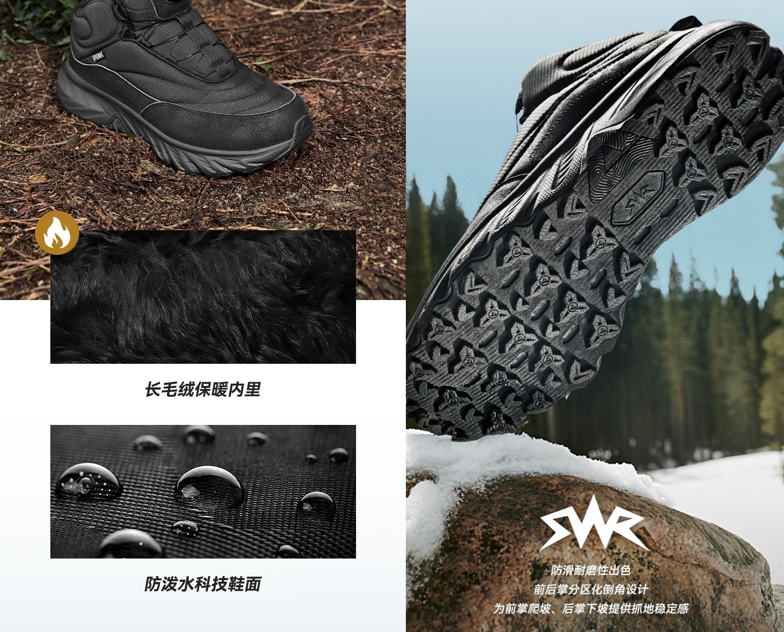 冬季天气恶劣,很多地方面临下雪路滑,这时候准备一双户外功能性棉鞋可以说是非常有必要的一件事了。雪地徒步、日常通勤、户外爬山,真正实现一鞋多穿。态极科技中底加持,脚感无须担心。鞋身采用一体式车鼓设计,长毛绒保暖内里搭配防泼水科技材料,全掌橡胶SWR止滑提升耐磨抓地性能,既保证了冬季穿着时保暖的需求,也针对一些融雪或雨季恶劣天气下起到了一定的保护。运用悬扣取代传统系带,穿脱松紧调节更方便。冬季准备一双保暖又兼具户外功能的棉靴可以说是非常有必要了,2开的新品发售价相比市面很多户外靴,真的是性价比拉满了。