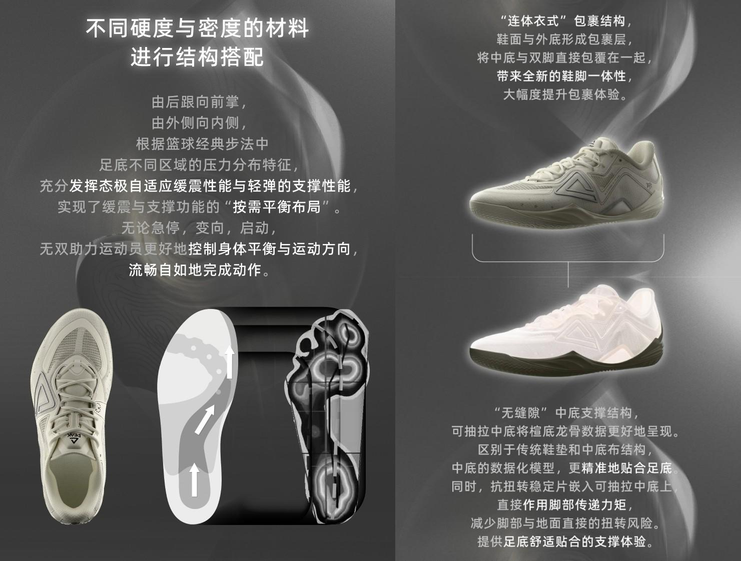 要说到今年篮球鞋圈的一股清流,那就不得不提匹克的新篮球鞋王炸系列---【匹克无双】。打破公式化造鞋模式,极具创新的外观与科技设计,发售初期属于是补多少卖多少的状态,可见这双匹克无双被球友们的认可程度。以薄底快靴为设计思路,1.5mm极低落差,实现极致的贴地灵活,低落差使得前后掌高度更加接近自然脚型的状态,能让双脚更直接感受地面,提供出色场地感,快速变向与急停动作时反馈更灵敏。首创水平缓震科技专利【可抽拉中底】,将不同缓震性能材料在中底上进行科学配比调整,根据足底不同区域的压力分布特征充分发挥态极自适应缓震性能与轻弹的支撑性能,实现了缓震与支撑功能的“按需平衡布局”,无论急停,变向,启动,都能助力流畅自如地完成动作。