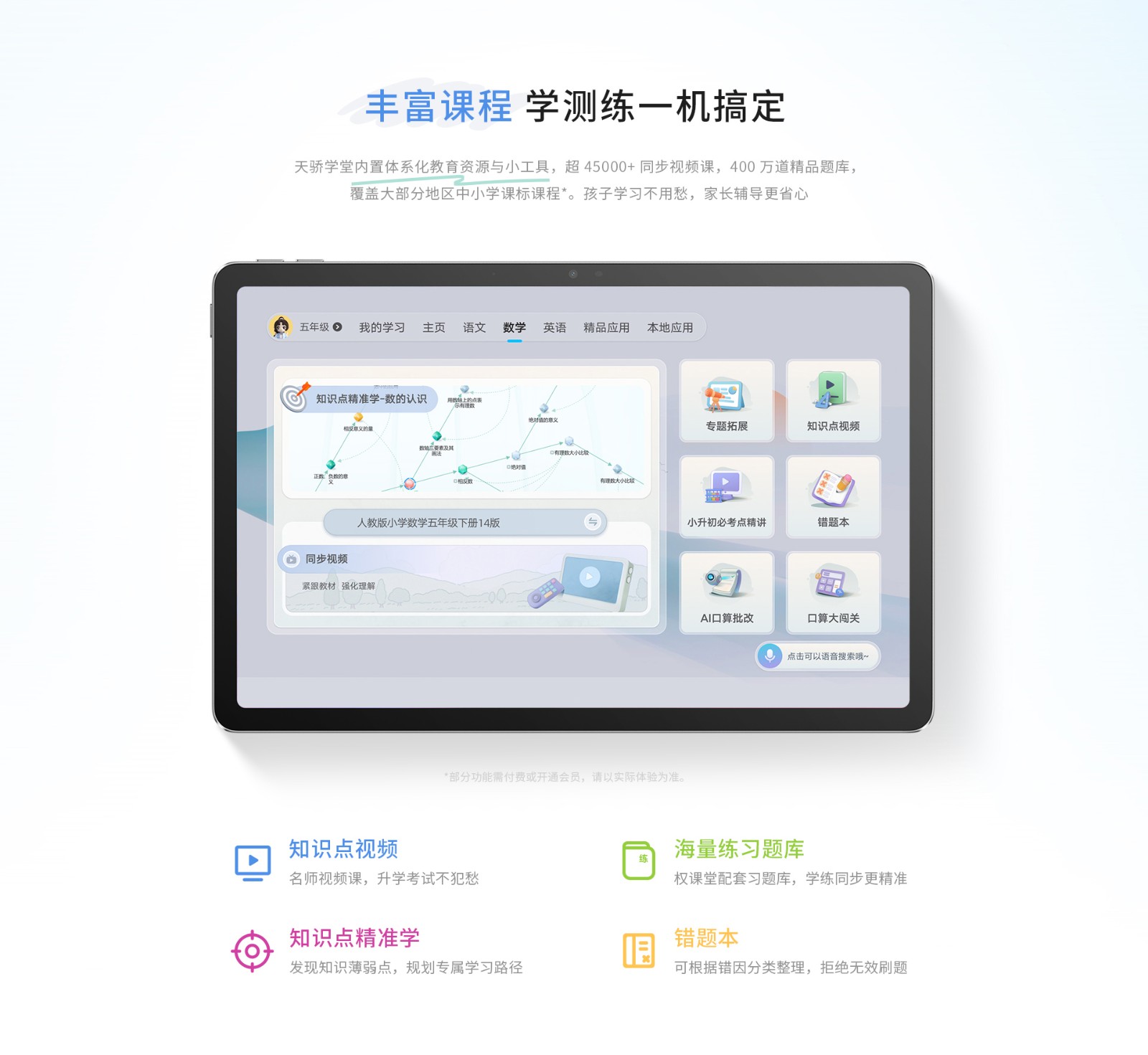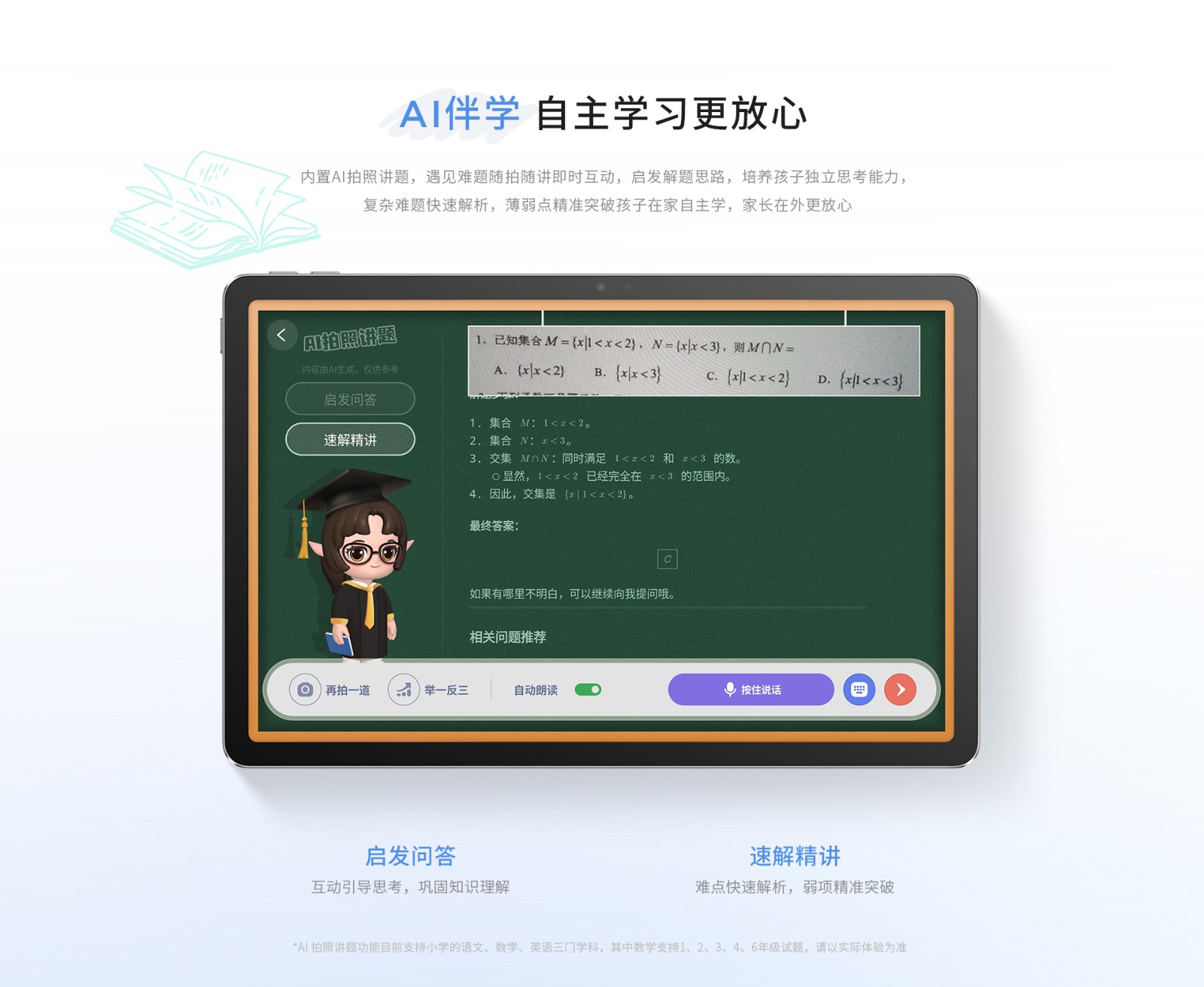 性能完全能满足日常需求,天玑6300芯片搭配最高8GB内存,同时开网课软件、文档和词典APP也不卡顿,最大支持2TB存储扩容,存满一学期的网课回放和学习资料毫无压力。AI网课伴学功能特别贴心,内置45000+名师视频课,遇到难题拍一下就能触发AI讲题,家长还能远程管控使用时长,避免孩子沉迷娱乐。7040mAh电池能支撑11小时连续网课,20W快充让午休半小时就能回血大半,480g的轻薄机身单手拿握也轻松。