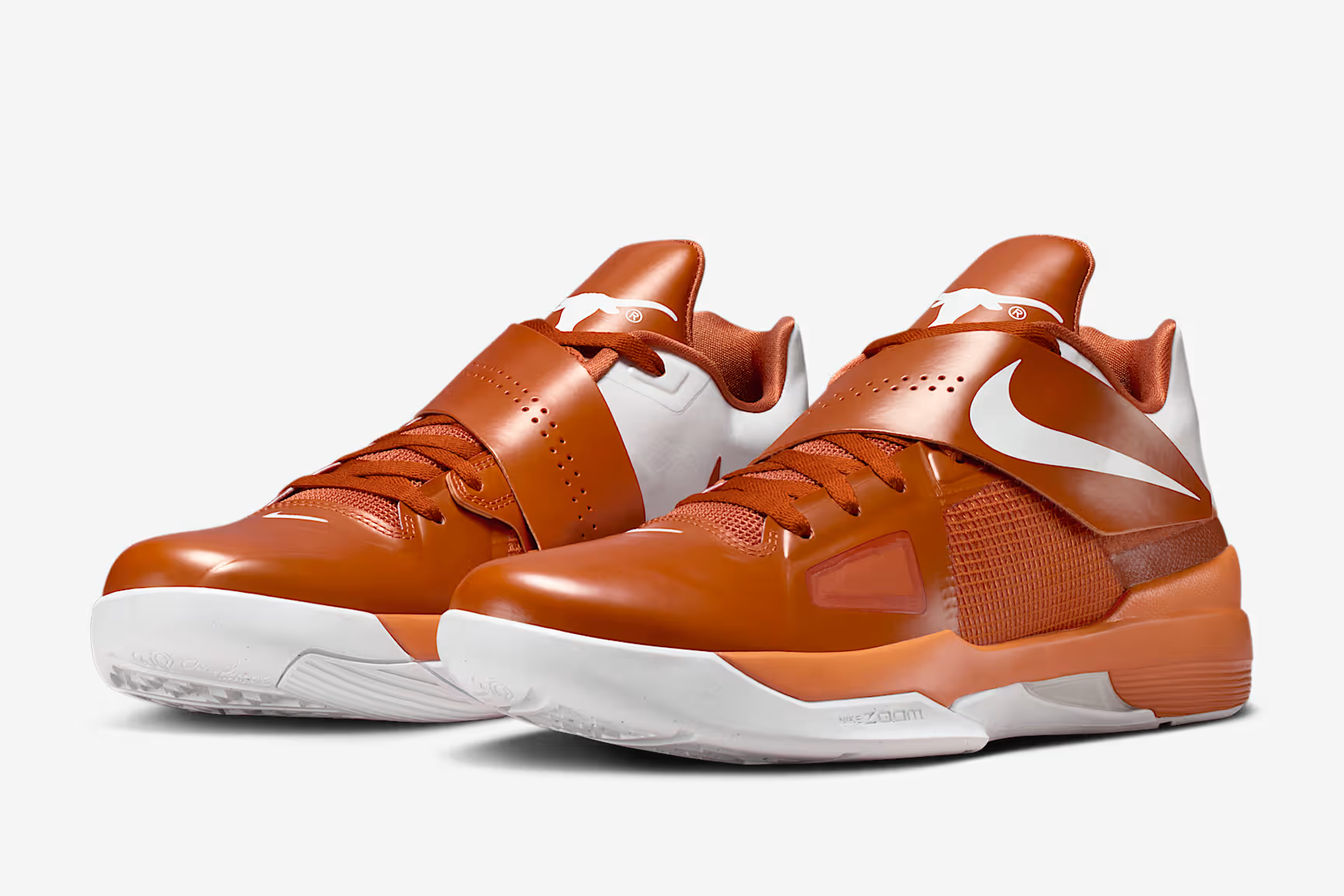校友文化是美国篮球圈绕不开的话题,从而也衍生了诸多球鞋产品。这双近期回归的 Nike KD4 “Texas”,就是在致敬杜兰特的大学母校德克萨斯大学长角牛队。外观配色来自杜兰特的大学母校德克萨斯大学,配色还原长角牛队经典造型,鞋面自带一点金属质感。外底乍一看是纯白色,但其实有着细微的颗粒点缀。作为难得市售的 NCAA 大学 PE,这双无论对于杜兰特粉丝还是喜欢大学 PE 的玩家都是不容错过的。