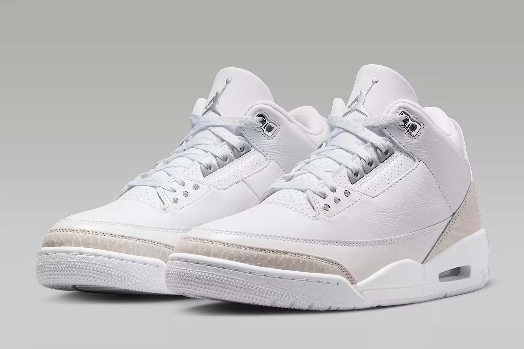 Air Jordan 3 “Pure Money”首次亮相是在 2007 年,阔别多年终于复刻,想入手的玩家终于能圆梦了。白色皮革鞋身搭配同色系爆裂纹与后跟,银色鞋带孔与镜面漆皮挡泥板形成微妙反差。并非元年细节完整回归,但人气相当不错,一袭纯白装扮,克制点缀银色,释放出干净素雅的感受。流畅线条与中性色调带来十足的百搭属性,成为日常上脚的最佳拍档。