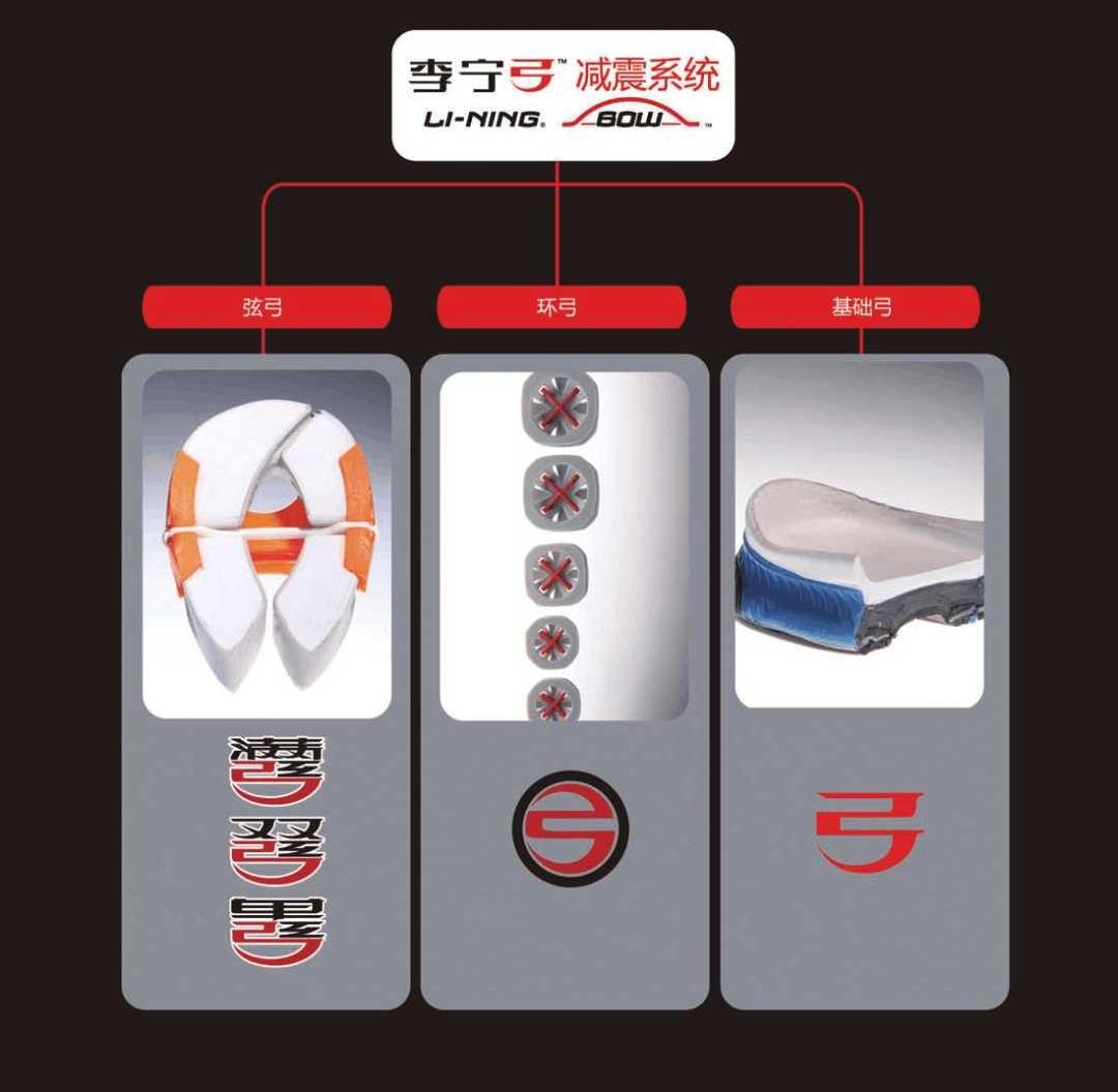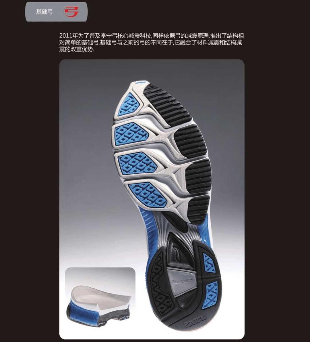 为了让李宁弓科技更加普及,2011年推出了基础弓科技,这种科技结构简单,价格实惠。简而言之就是弓形的硬质材料上覆盖上高弹缓震材料,利用硬质弓的形变和泡棉提供减震和回弹。