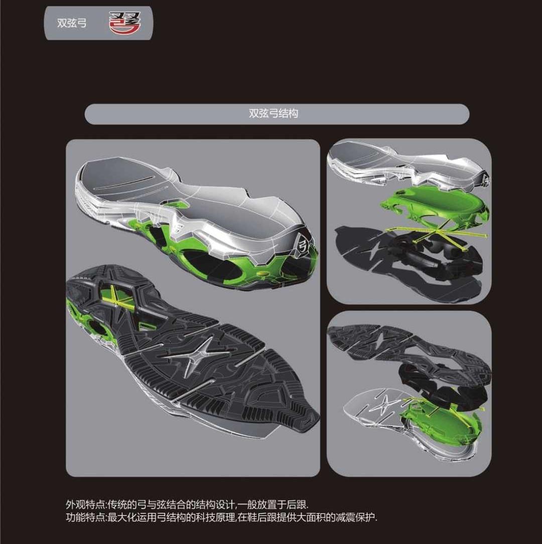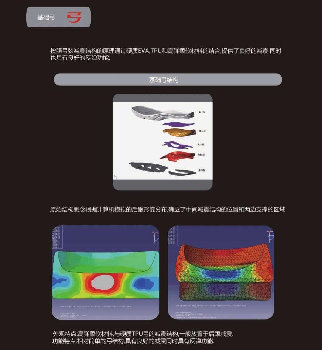 面世的第一代“李宁弓”——弦弓结构(▲ 第一款李宁弓跑鞋图中显示的只是简化了的的效果图)实际非常复杂。鞋的后跟有一个封闭式的横纵向交叉一体的拱形,具有相当大的形变能力,在脚后跟着地过程中,能够通过适当的形变缓冲弓上方的冲击。并在纵向添加了一根韧性极强的弦,既可以为减震形变提供伸展能力,同时保证拱形结构的正常收缩。