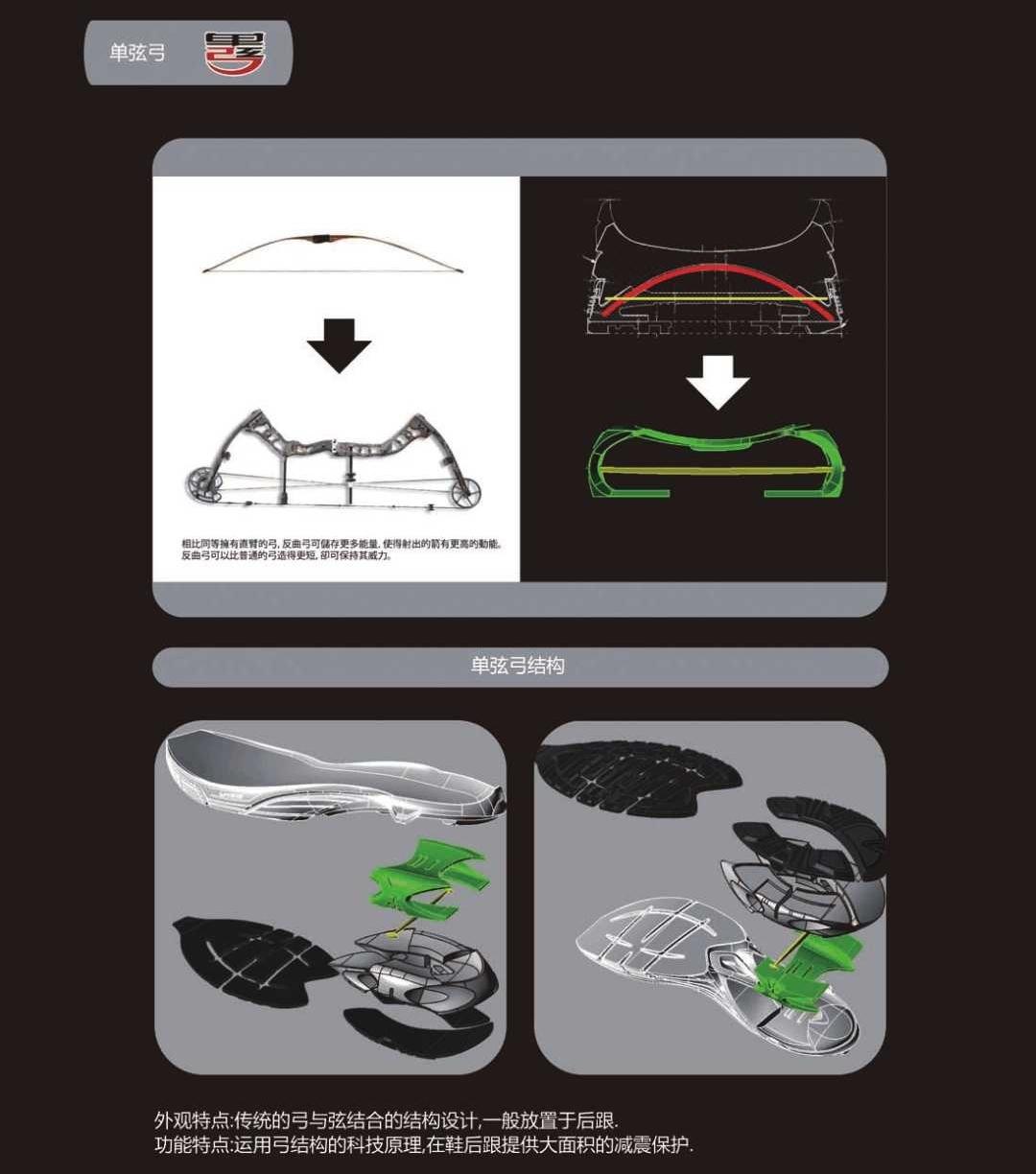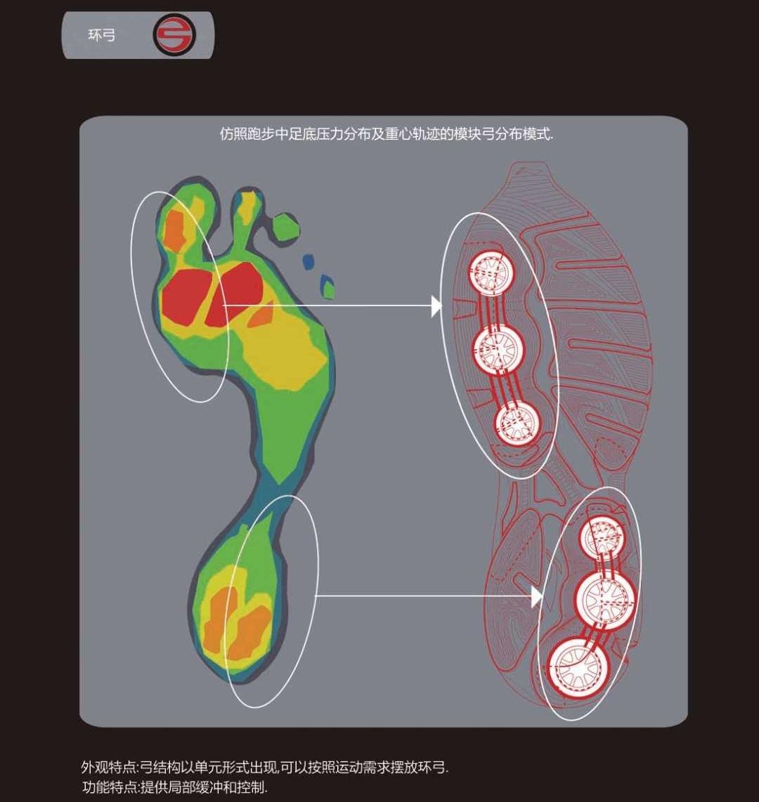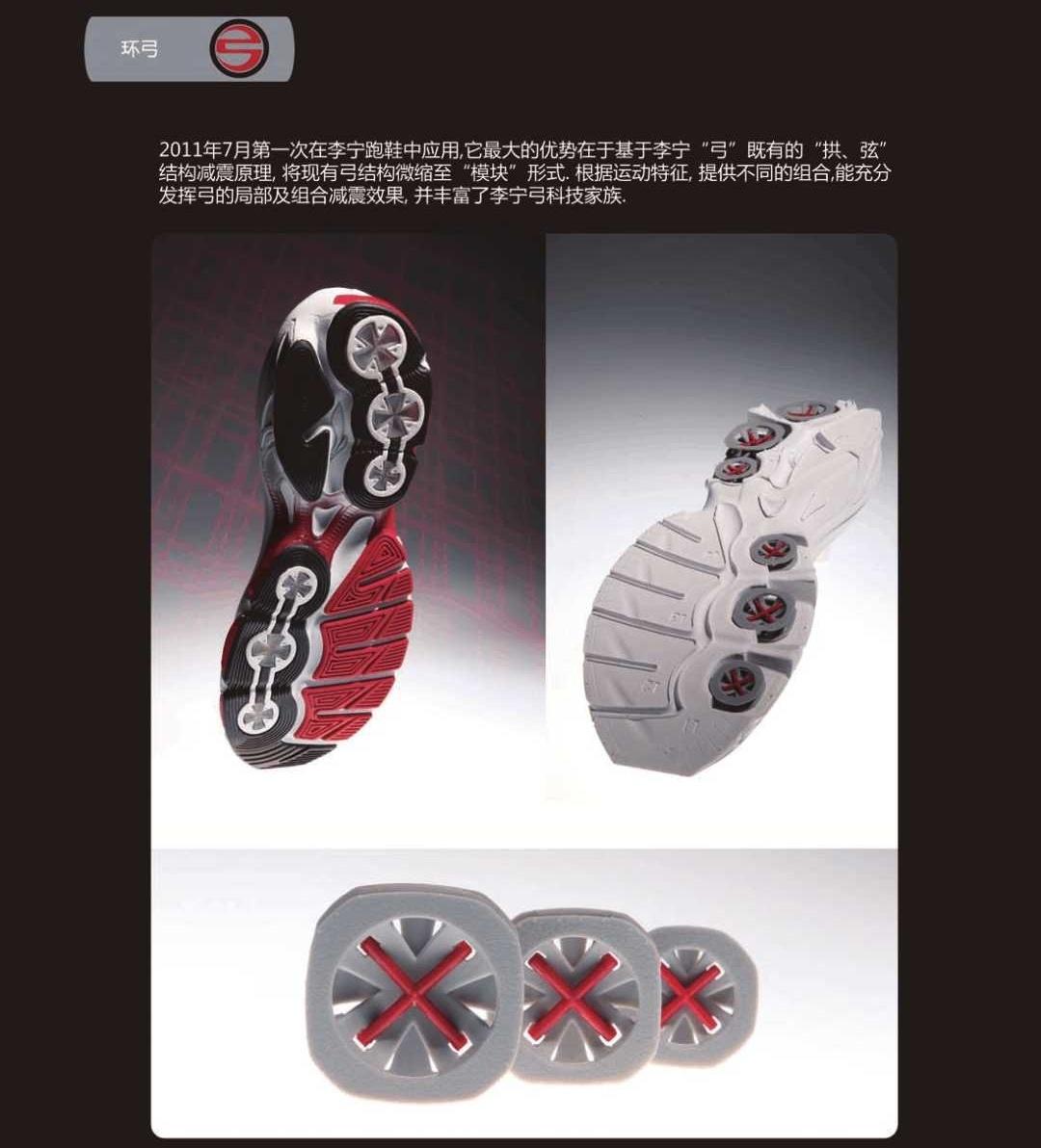 李宁弓最初的设计主要应用于慢跑,由于脚在落地时最先受到冲击的是后跟,因此弓也只被设置在后跟处。而环弓的出现,让弓的单元结构小型化、模块化,一个弓单元是一个十字拱形片加十字弦的结构,而不同尺寸、厚度的弓单元可以根据不同运动项目的特点和需求,分布在不同的受力位置,从而使“李宁弓”的应用领域更加广阔。