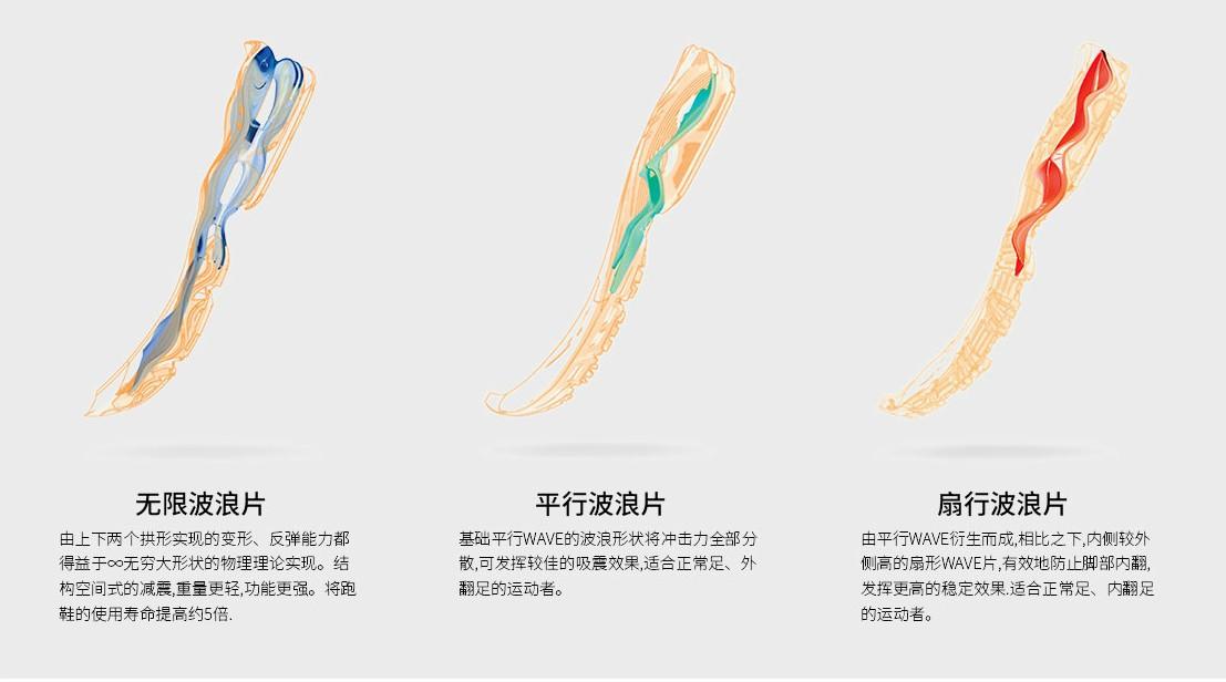 为了更好地满足不同运动需求,经过近30年的探索,美津浓根据结构和效果的不同将众多wave加以分类。