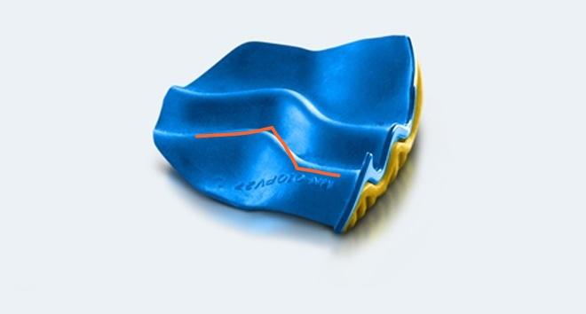 骨架式wave是将2片及以上的wave波浪片组合而成的立体构造,两片波浪片之间还有缓冲层。具有轻量、缓冲的优秀性能。下图的结构就是由2片wave波浪片组合而成的,这种两片式结构也有单独的名字—— DOUBLE FAN SHAPED WAVE(双层扇形波浪片,双层结构只是体现在足部内侧,外侧仍为单层)