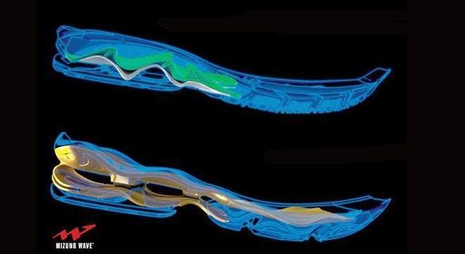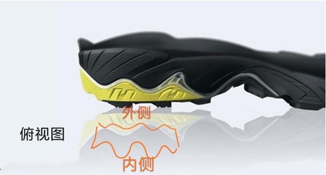在运用各种造型的wave来满足人们要求的同时,mizuno创造性的将两种以上不同材质组合到一起形成左右或者前后力学性能均不同的wave,经过反复调校,将最合适的材质使用在最需要的部分进行提升底部的性能。