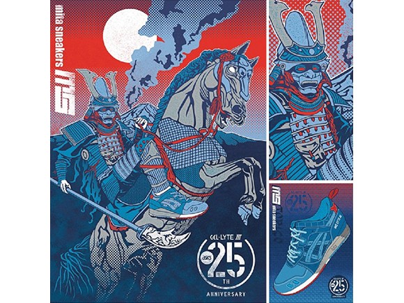 该款为25周年系列联名所推出的第一款,亦是十分精彩的开头,以大家熟知的Gel Lyte III为蓝本,创作上采用两种日本传统艺术形式——作为配色主旋律的蓝染技艺以及战国武士,骑在战马上的武士身穿武士盔甲,手持偃月刀,提缰勒马而起,赤色双瞳迸出十足杀意,血红缰绳更是渲染了杀戮之意。