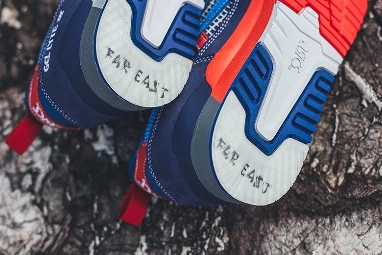蓝白红三色共同组成外底,给人一种高达配色的错觉,后跟配备的一小块水晶样底,映出FAR EAST字样,象征远东日本。