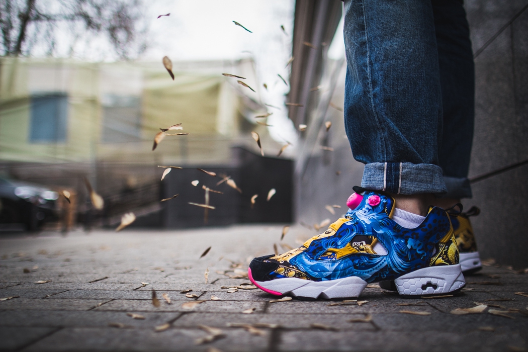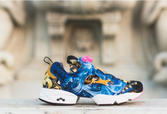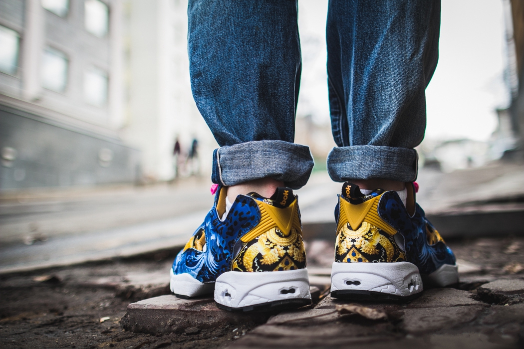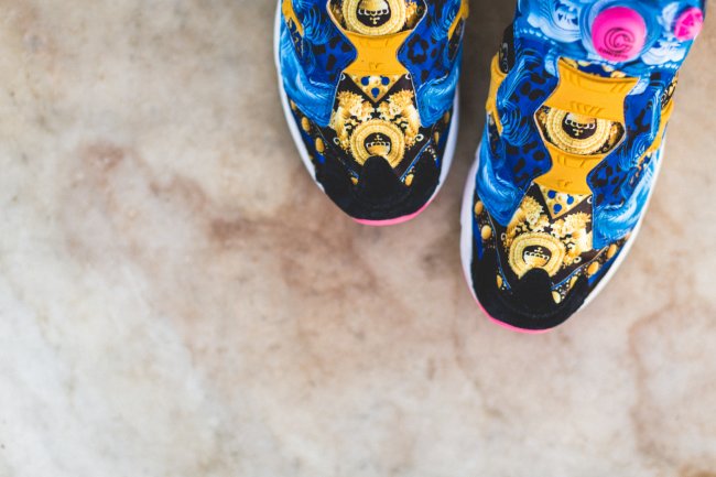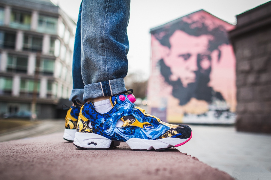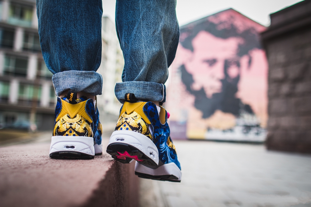 鞋款的灵感来源自意大利奢侈品牌Versace 以及 90 年代的Hip-Hop风格,以充满张力和奢华感的金色与蓝色为基调,融入华丽的巴洛克花纹打造鞋面,奢华如富丽堂皇的宫殿。再配以简约白色大底和粉色气泵阀门点缀,营造华丽与俏皮的对比感,整双鞋更是精致的不可言喻。