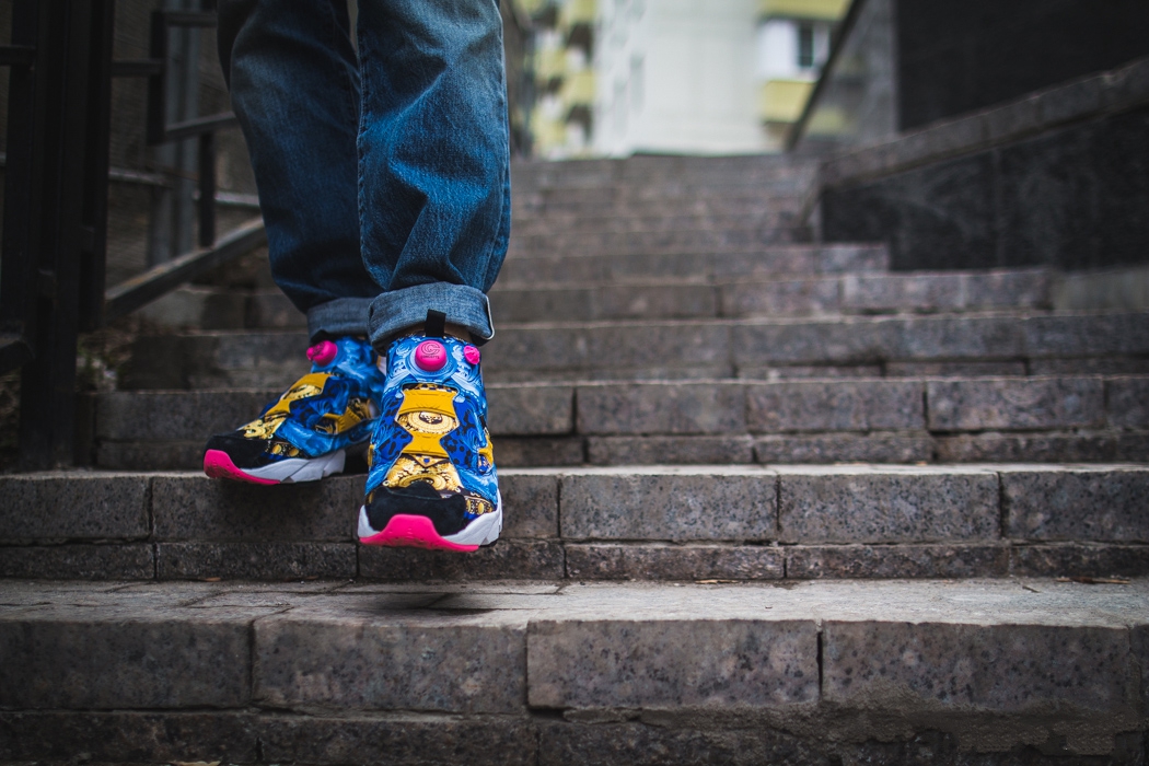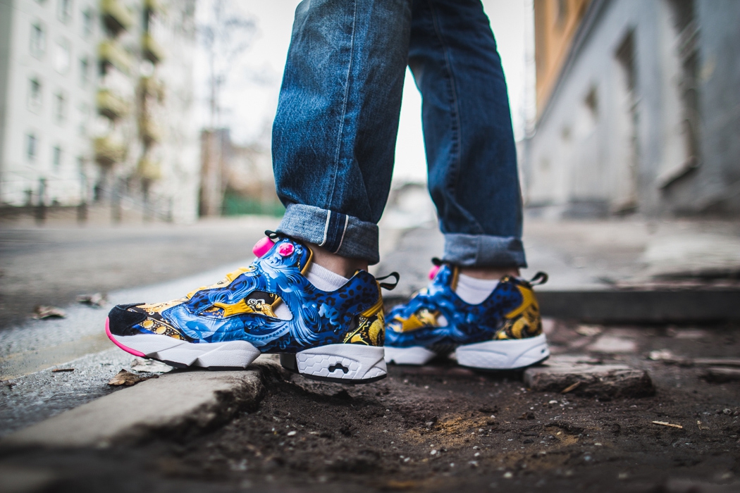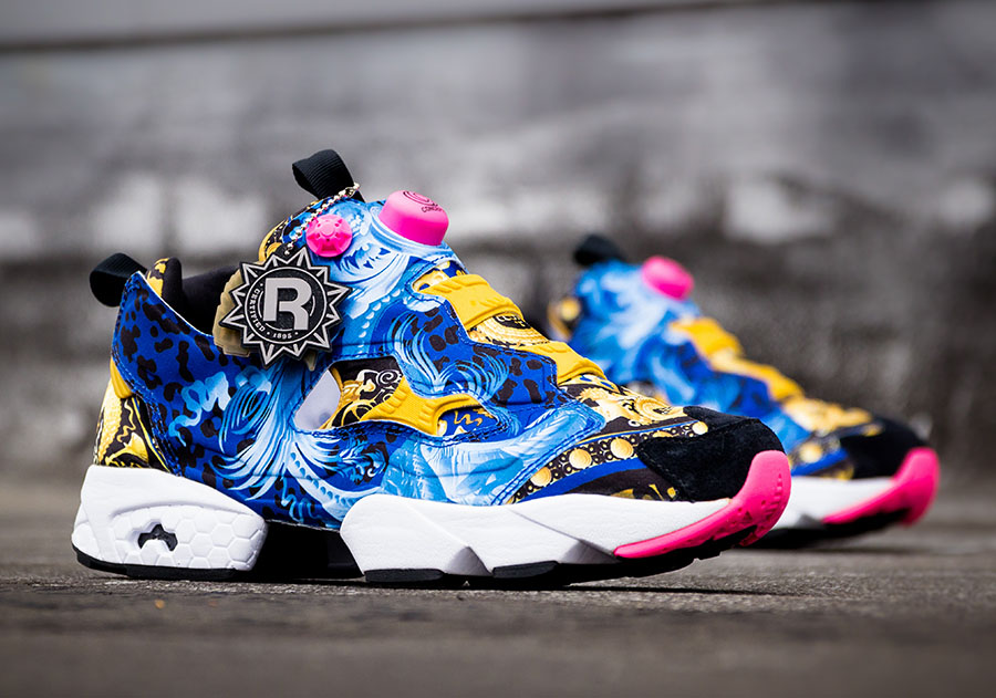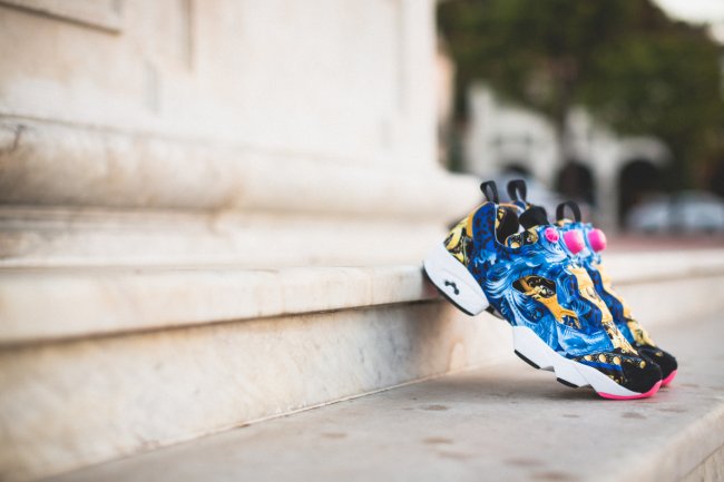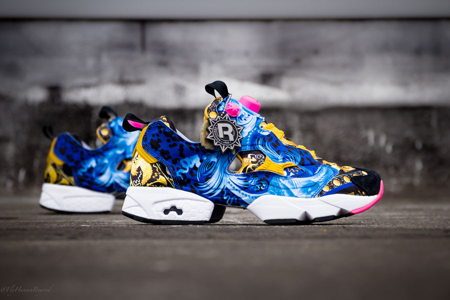 鞋款的灵感来源自意大利奢侈品牌Versace 以及 90 年代的Hip-Hop风格,以充满张力和奢华感的金色与蓝色为基调,融入华丽的巴洛克花纹打造鞋面,奢华如富丽堂皇的宫殿。再配以简约白色大底和粉色气泵阀门点缀,营造华丽与俏皮的对比感,整双鞋更是精致的不可言喻。