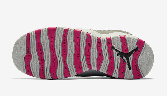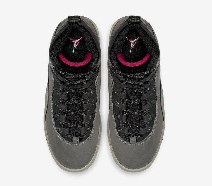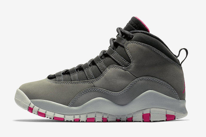 Jordan Brand将于本月再添Grade School独享新配色Air Jordan 10。鞋身选择深烟灰色搭配铁灰色,鞋舌内衬、刺绣以及大底细节点缀灯草粉色。款式货号487211-006,预计10月26日上市。