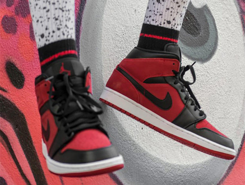 这款AIR JORDAN1 Mid采用了经典黑红色搭配整个鞋身,颇有AJ10G黑红禁穿神韵,不过鞋面材质有所区别吗,这款中帮鞋面红色占大部分上脚效果更加亮眼