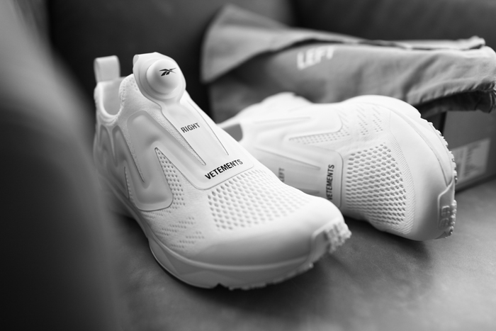 小白鞋在2015年取得的巨大成功之后逐渐走向疲软,复古跑鞋则在AJ,Yeezy的轮番轰炸之下难以扭转颓势。这个时候则有了Vetements与Reebok站了出来,将不再火热的两者相结合,推出了几乎是年度最美联名鞋款之一:Vetements x Reebok Pump Supreme,以Pump Fury为蓝本,简化了侧面的鞋面层次感,填补了坡跟鞋一样的鞋底,整双鞋呈现出优雅的线条。