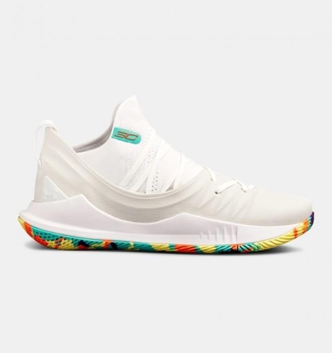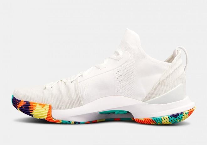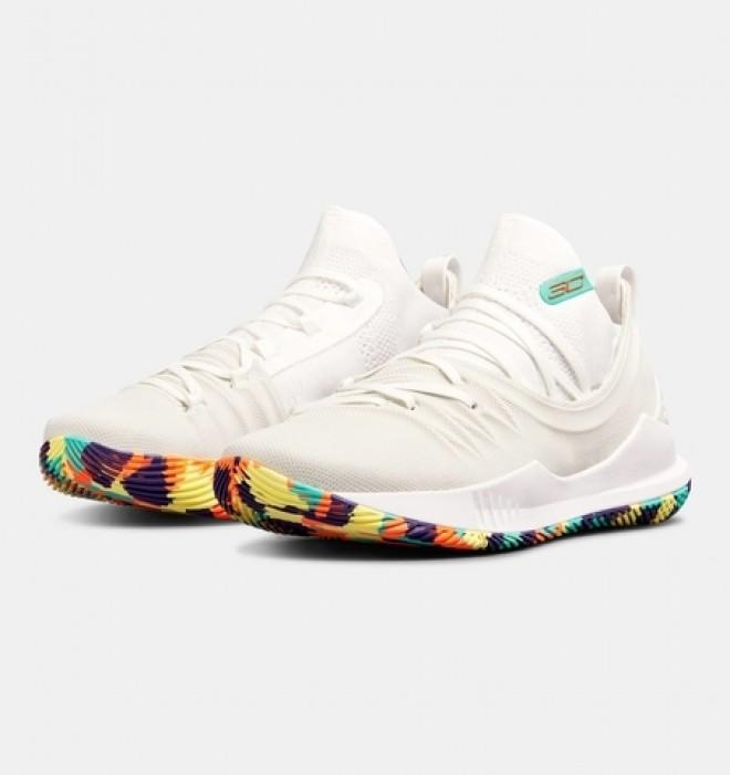 近日网络上曝光了全新的Under Armour Curry 5 Confetti Soles配色,纯白色的鞋身设计,在鞋舌上带有淡绿色的条形标签上印有金色SC的字样以此来表明身份,令人惊喜的是鞋款的大底带有五彩纸屑色的图案藏于鞋底。