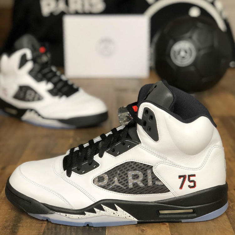 同样顶着亲友限定版本头衔上榜的Air Jordan鞋款还有巴黎圣日耳曼Air Jordan 5“PSG”,同Air Jordan 3“Quai 54”一样,亲友限定版本的Air Jordan 5“PSG”一改市售版本的黑色麂皮鞋面,而是采用白色的优质皮革打造鞋面。除了鞋面材质的更改之外,亲友限定版本在鞋网的“PARIS”字样、刺绣的数字“75”与后跟的联名Logo等彰显鞋款联名身份的细节方面均与市售版本保持一致。