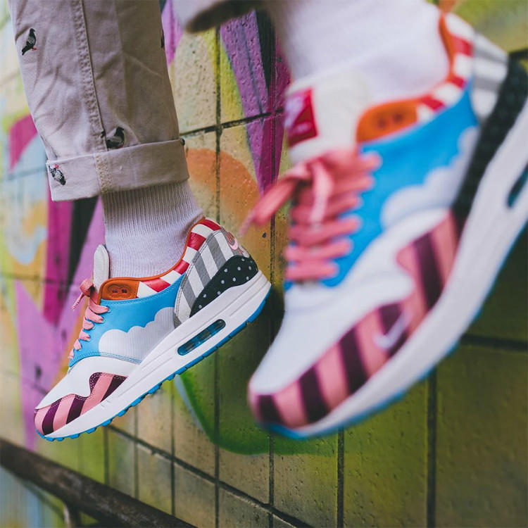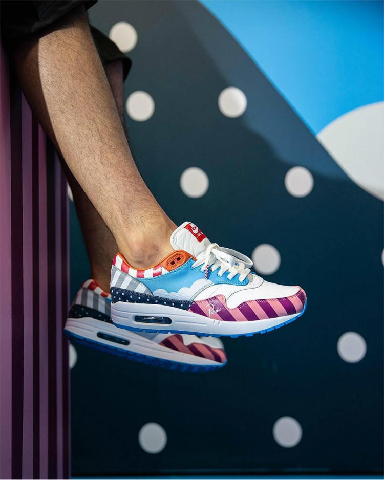 榜单的第三名依旧是来自Nike的一双非市售亲友限定版鞋款——Parra x Air Max 1 F&F,Parra x Nike Air Max 1作为Nike与荷兰艺术家Parra再度以经典的Air Max 1作为蓝本打造的联名,Parra以独特的艺术手法展现了抽象风景画面——彩色条纹及波点的不同纹理碰撞呈现出一幅抽象的蓝天白云风景画。每次Parra都能够同Nike合作创造出天价鞋款,此次也不例外——德国著名球鞋店铺Solebox在发售Parra x Nike Air Max 1要求购买者必须穿着鞋款走出鞋店,以打击鞋贩子对于这双超限量艺术家合作款鞋子的炒卖。