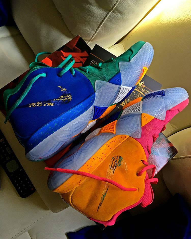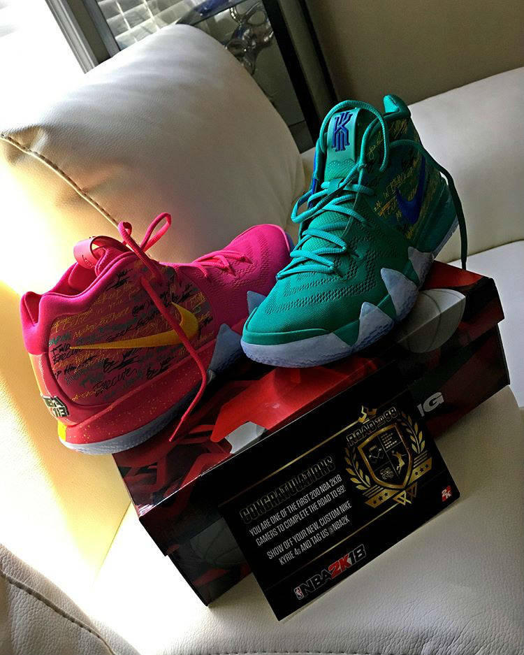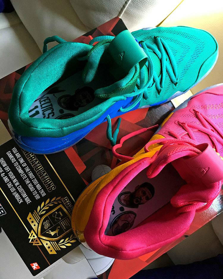 全新版本的2K18不仅以凯里-欧文为封面,更是打造了玩家专属配色的Nike Kyrie 4“NBA 2K”用以赠送在NBA 2K18 MC(My Career/我的生涯)模式中能力值达到99的前两百名玩家。这双Nike Kyrie 4“NBA 2K”的独特之处不仅在其为特别定制版的超限量鞋款,鞋身的配色也是一大十足的亮点——在以左右脚鸳鸯配色打造的同时,每只鞋还都是内外异色,后跟彰显身份的2K18 Logo、鞋垫上的欧文照片以及鞋面外侧还绣有的涂鸦字体,都带来满满的精致细节感受!
