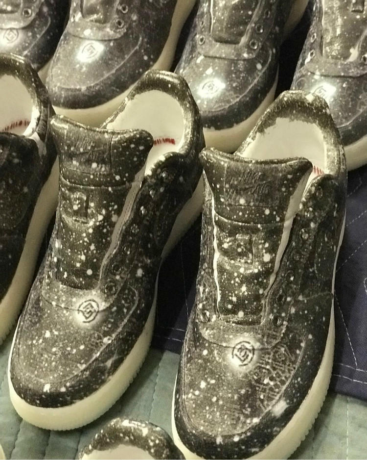 继曾经那双经典的红色丝绸CLOT x Air Force 1之后,冠希哥携手Nike将CLOT联名再度登陆Air Force 1经典人气鞋型,并同样以丝绸为主题将曾经的红丝绸版本CLOT x Air Force 1换装带回——白丝绸版本CLOT x Air Force 1。而为了庆祝 JUICE洛杉矶全新门店的开幕,CLOT携手客制单位 MAPLEWOOD MFG在白丝绸版本CLOT x Air Force 1上运用独特的水转印技术,打造了两款包含“Spider Web”蜘蛛网和“Star All Over”星空两种鞋面图案在内的CLOT x NikeLab Silk Air Force 1全新定制系列。虽然两双鞋款定价均为$450美元,但“Star All Over”星空图案鞋面的价格一路狂飙至$1467美元!