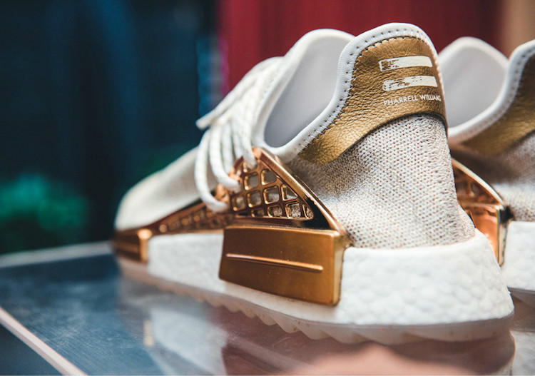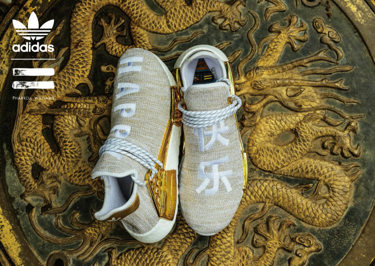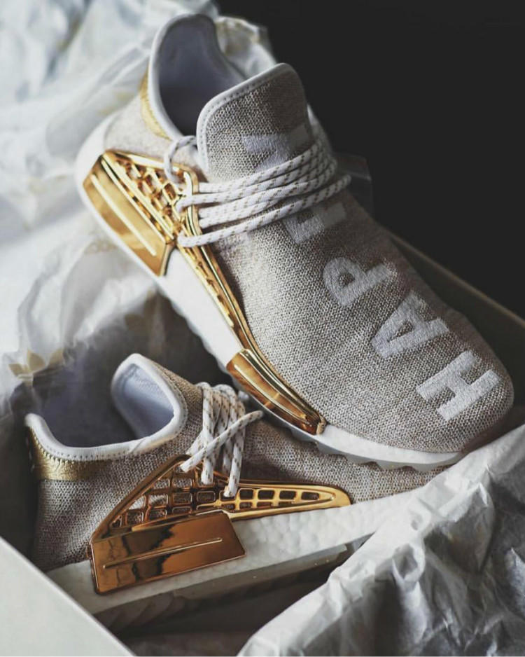 菲董联名 Pharrell Williams x adidas Originals Hu NMD Trail“中国限定”系列中的“快乐 HAPPY”配色鞋款曾一度领跑本年度最贵鞋款,该系列囊括“热情 PASSION”、“和平 PEACE”、“青年 YOUTH”和“快乐 HAPPY”四大配色主题,其中有着亲友限定版本身份的“快乐 HAPPY”主题,以左脚“快乐”右脚“HAPPY”的刺绣呈现来彰显主题。奢华的白金色调加之其全球300双的限量,市场价格曾一度高达 $11000美元!