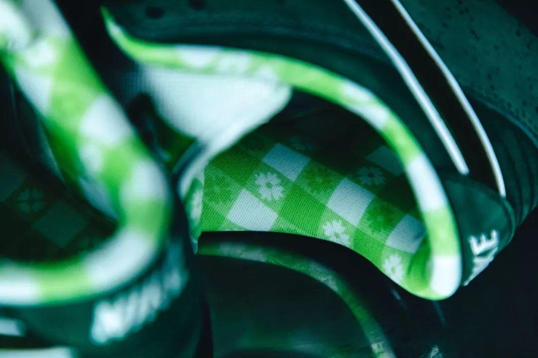 细节方面鞋内衬部分选择白紫棋盘格作为点缀,正好与印有「Nike sb」logo的白色鞋舌呼应。更加有趣的是因为是龙虾系列,鞋头还会被套上深蓝色橡胶带,代表龙虾被捆住的钳子。