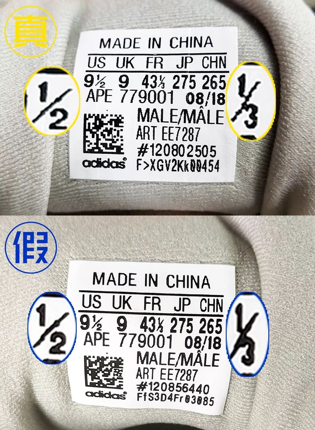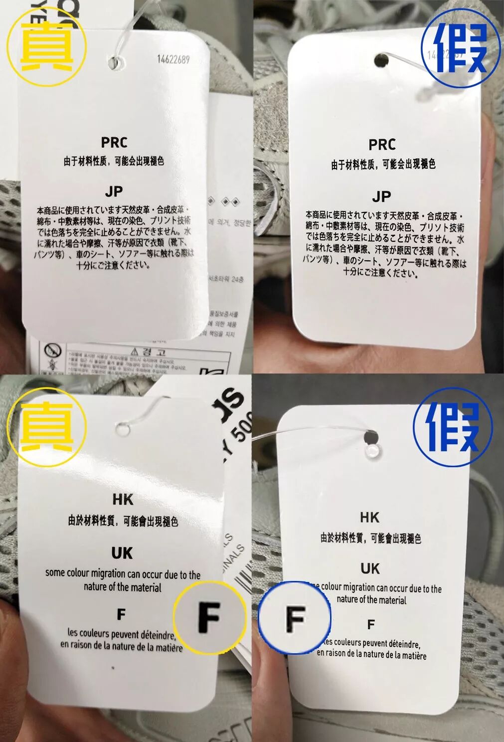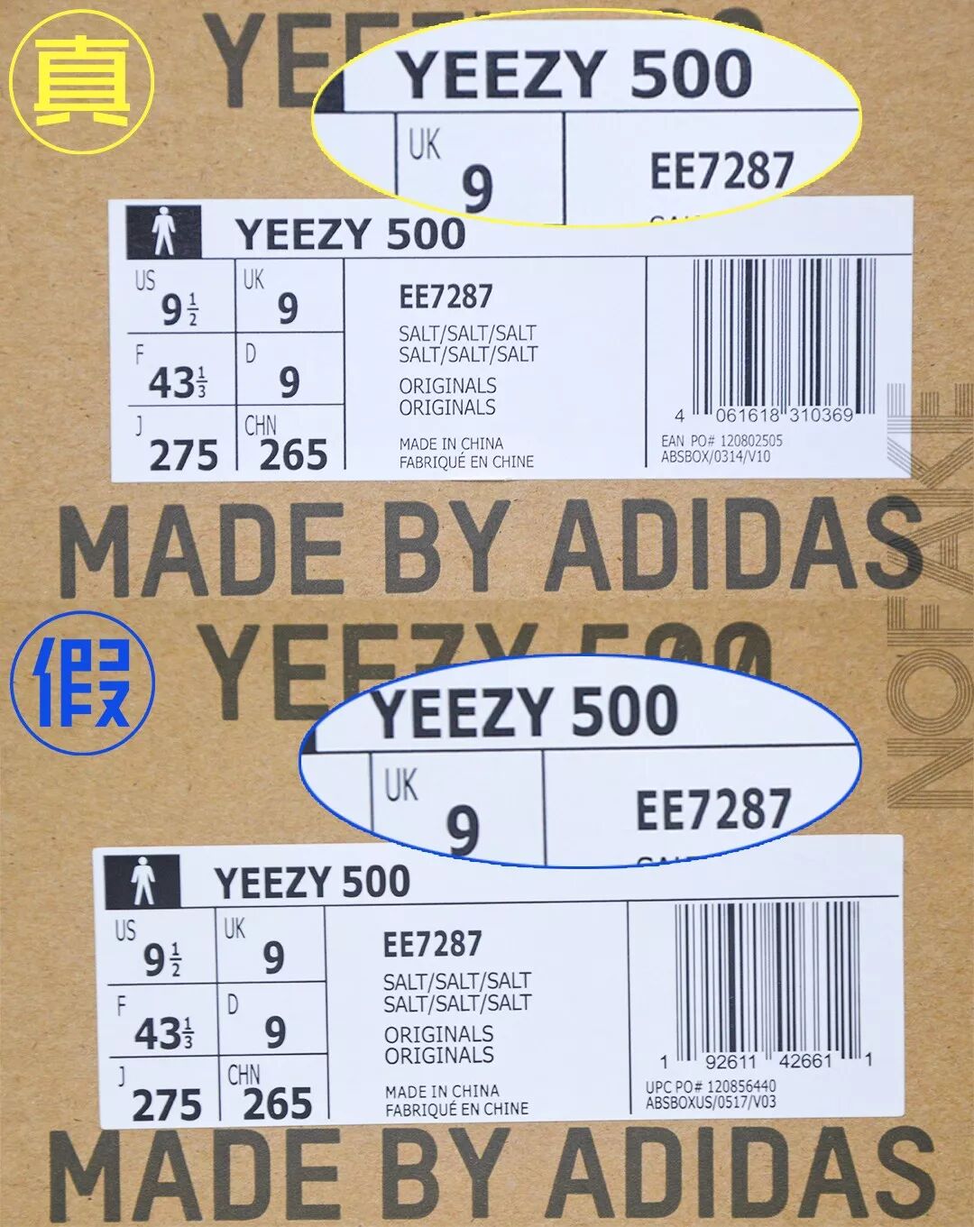 假鞋鞋盒侧标上“yeezy 500”的字体、位置和真鞋的都不同。