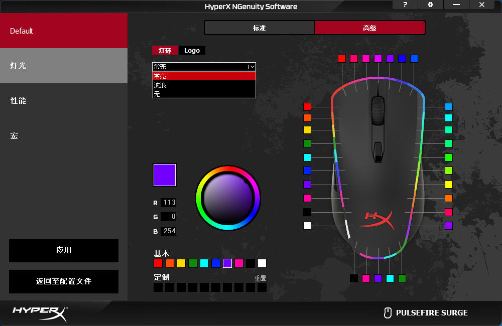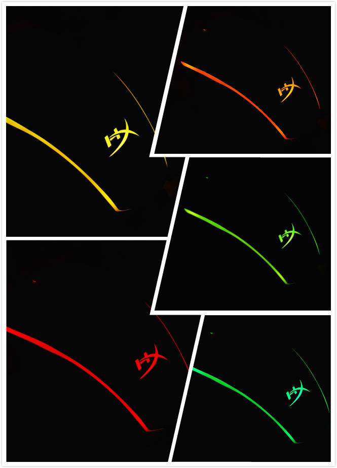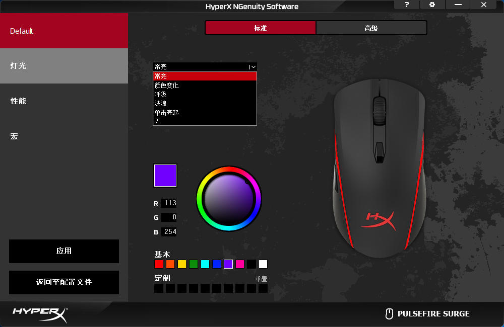 金士顿巨浪的标准灯光设定界面中支持5种灯光特效,除了标准的常亮外,还有颜色渐变、呼吸、波浪以及单击亮起,在某些灯效可以设定双色和单色还有颜色轮询,和一般RGB特效基本一致。