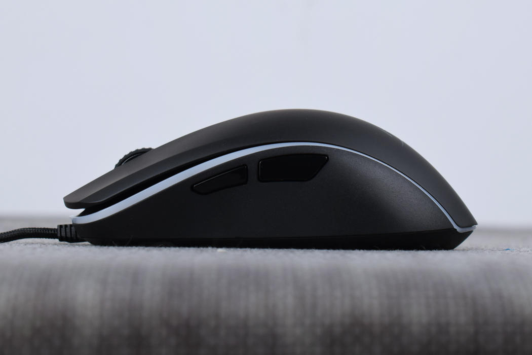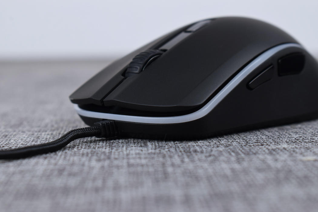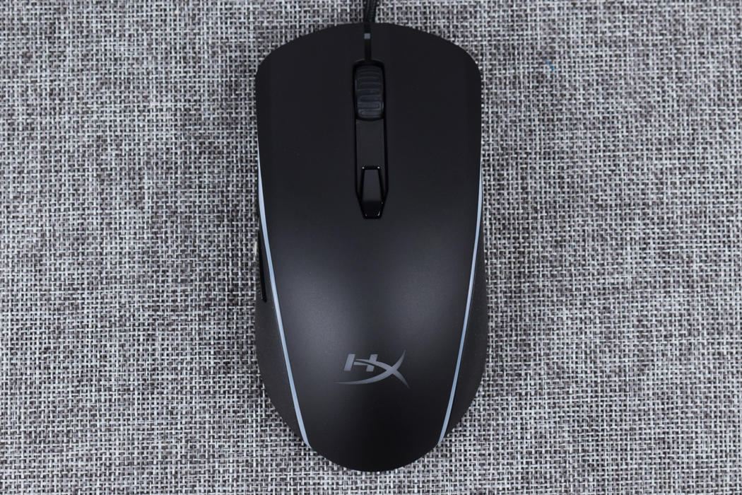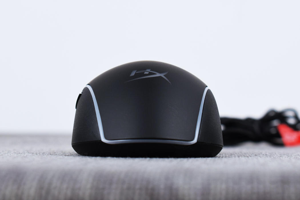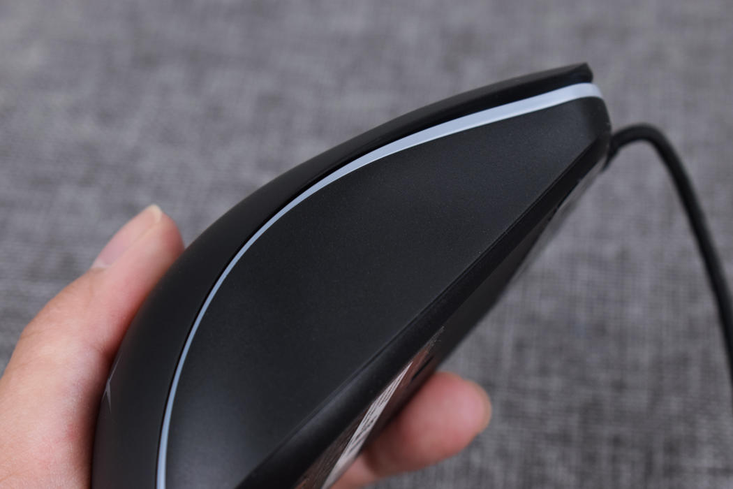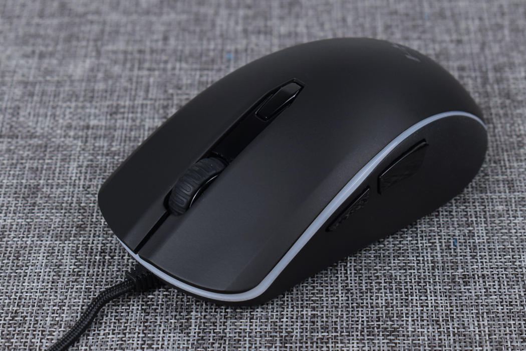金士顿巨浪游戏鼠标机身部分已全黑配色为主体,辅以RGB导光灯条环绕一周,鼠标本身使用左右对称结构设计,整体设计偏圆润风格,没有菱角分明的搁手问题,同时并设有侧键,这种设计想法上有点像罗技的G PRO。