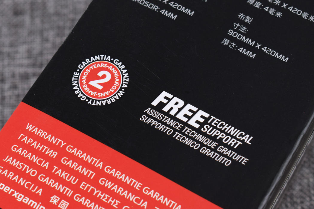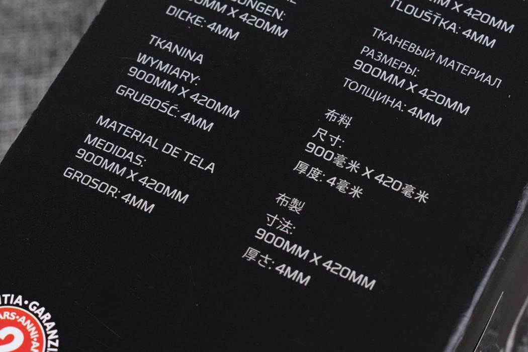 管家本次入手的复仇女神S定制版鼠标垫是900mm X 420mm尺寸,也就是大桌布的级别了,而鼠标垫厚度为4mm,和刚才巨浪鼠标一样,复仇女神S鼠标垫同样提供2年质保,相对于其他大厂1年质保显得非常良心了。