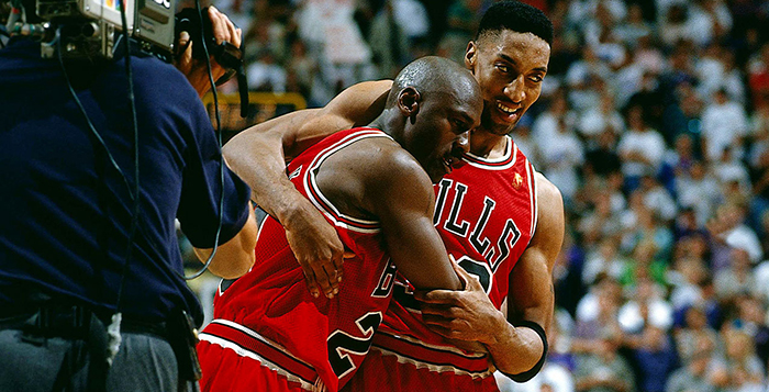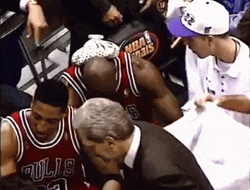 由于病痛的折磨,在比赛开始的第一节,MJ只拿到4分,身体异常虚弱。但队友皮蓬一直对他说:“我们会做好防守的,不要透支你自己了,在进攻端留点体力吧,我们知道你一定可以搞定比赛,我会扶你下场,保护你不受伤。”皮蓬通过双人包夹帮他防守,在进攻端给他球权。