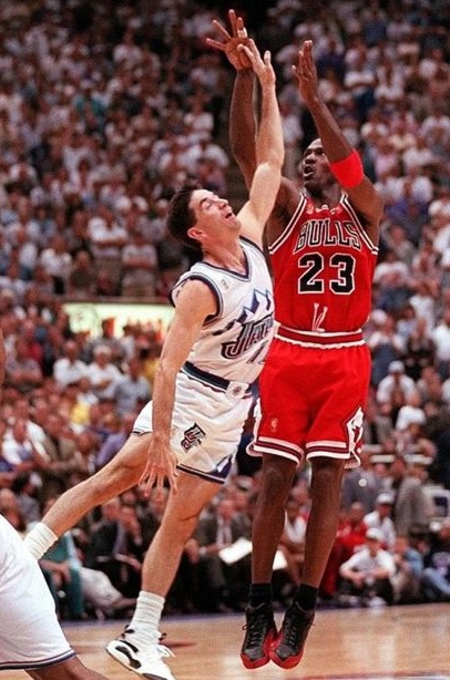 战斗到了第四节,MJ势不可挡,独自拿下15分,并在最后25S以一记致命三分球,定格了公牛的胜利。