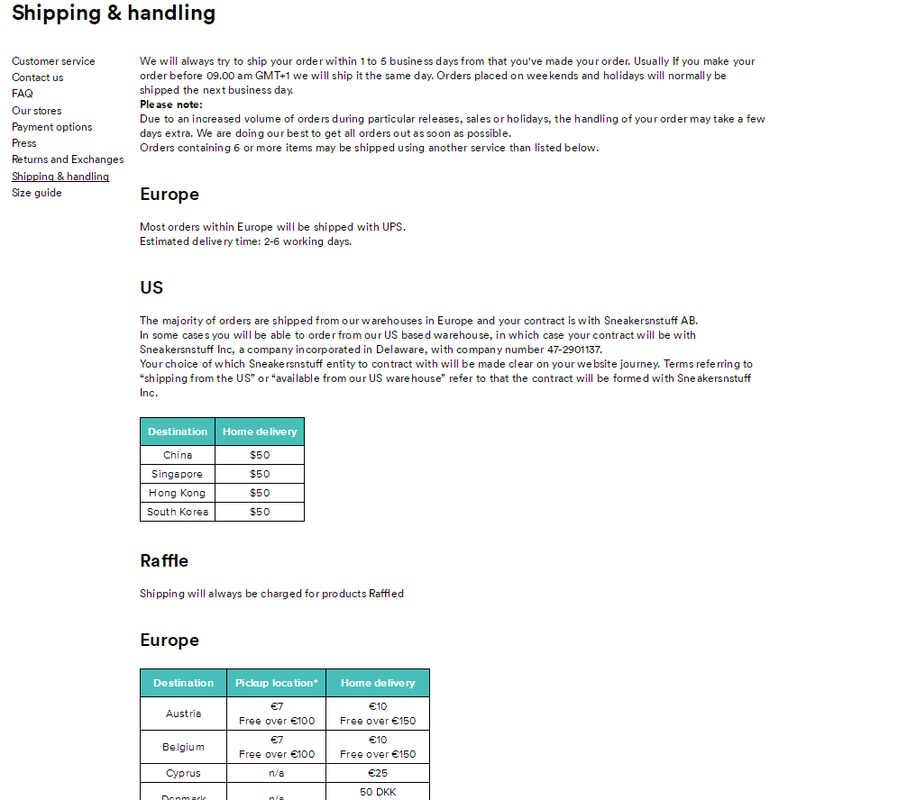 大家可以去Sneakersnstuff官网查看具体的运费和运输方式(点击此进入)