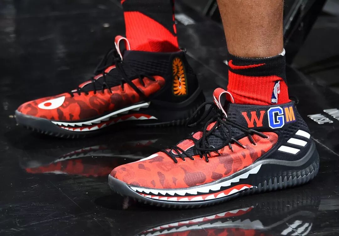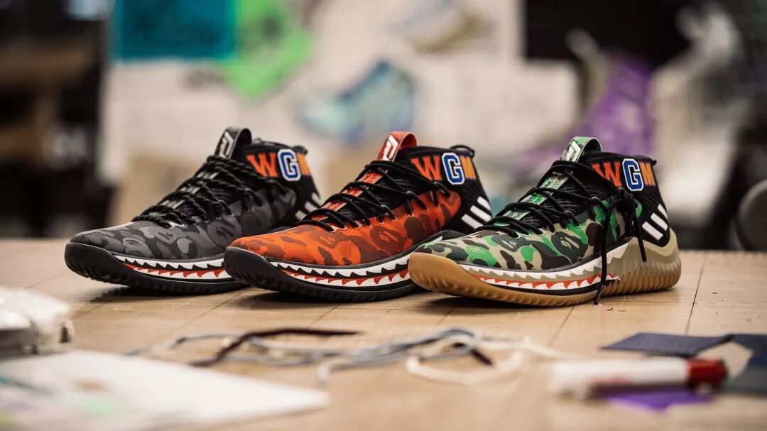 波特兰开拓者后卫Damian Lillard的签名鞋adidas Dame 4是BAPE x adidas合作发布的第一款篮球鞋,推出了“绿色迷彩”、“黑色迷彩”以及“红色迷彩”三个版本,并搭上了2018年NBA全明星周末的快车。两对鞋都饰有各种图案,包括鞋帮上的“WGM”字样,鞋底夹层上的BAPE鲨鱼牙齿,脚趾上有鲨鱼眼睛,内踝上有老虎图案。