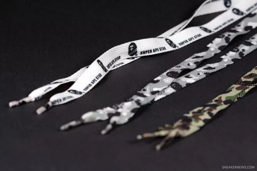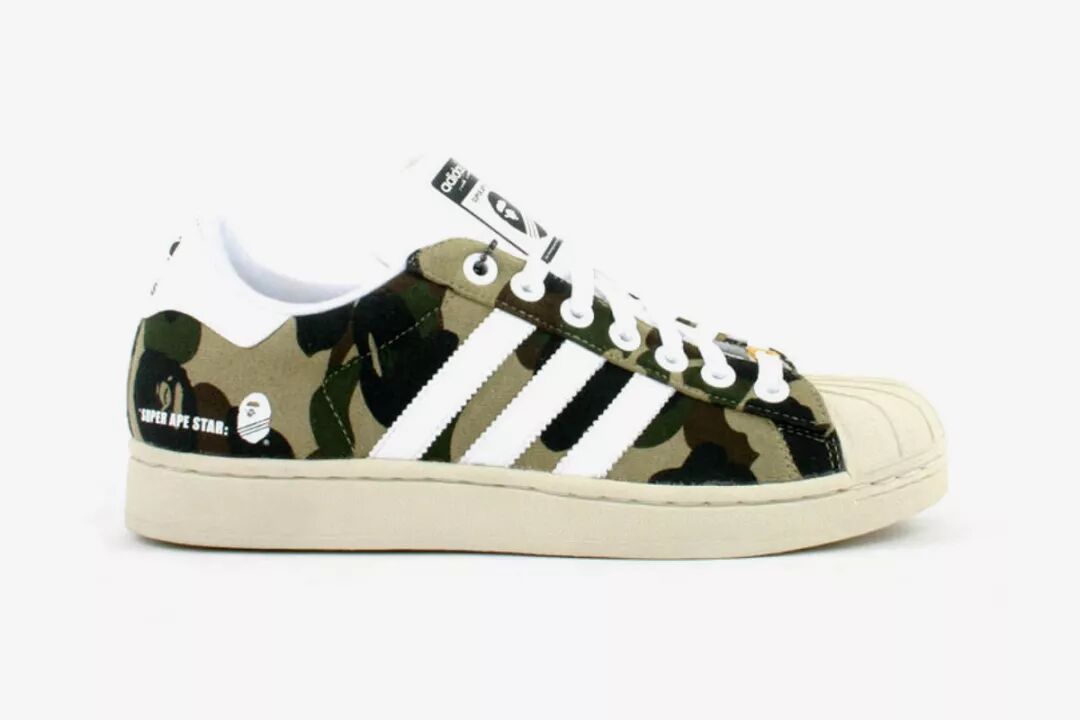 BAPE和adidas的第一次合作是在“The Respect is Mutual”的口号下,是对Superstar进行的一次修改。这双Superstar推出了白色和黑色两种配色,白色版本的皮革鞋面上采用重复的猿头图案点缀。随后又有两种款式,一种运用了奢华的麂皮,饰有金箔图案,另一双是帆布鞋面,饰有BAPE标志性迷彩印花。