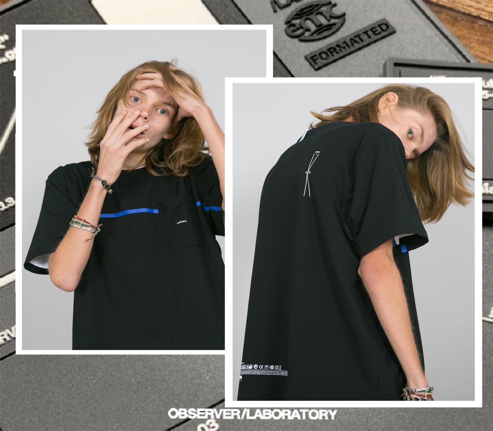 设计亮点:第五代OBSERVER LAB基础短T在经典的版型上让整体廓形更加舒适,口袋拼贴设计以及贯穿式横条印花作为视觉点缀,也丰富了简单打底衣物的细节感,