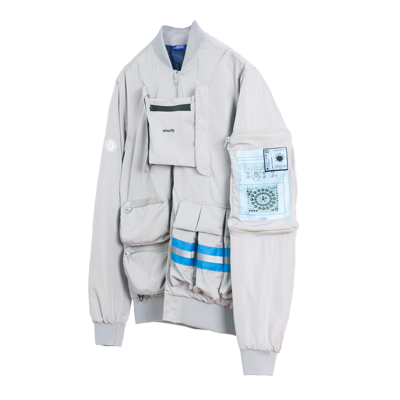 设计亮点:将赫维留星图所保留下来的星座图进行重塑并以满版印花的方式呈现于MA-1内里,并结合经典科幻电影《少数派报告》,选用科幻质感满载的灰色面料呈现出未来作战服的既视感。