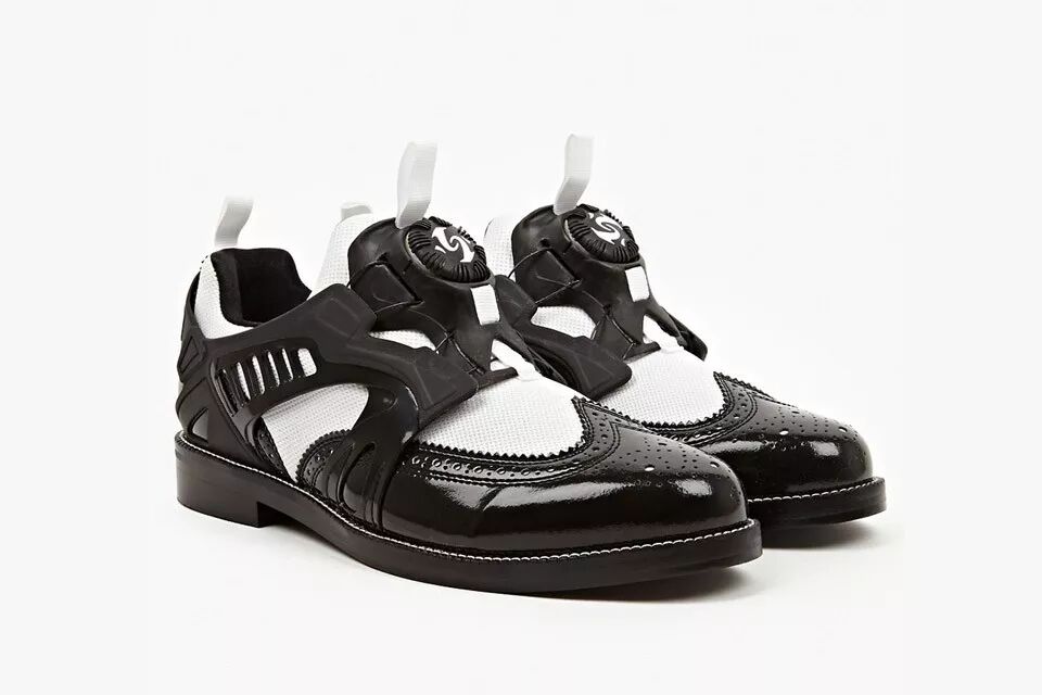 相比于这种在官方合作中夹带私货的操作,三原康裕在自家品牌中的鞋履设计更为大胆。除开前后对接的套路之外,左右开弓的姿势也令人叹为观止,要知这可是十多年前便以推出的概念,其先锋程度不言而喻。