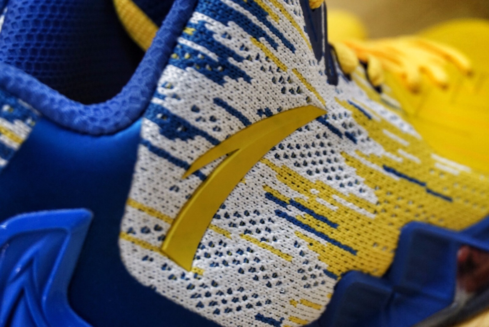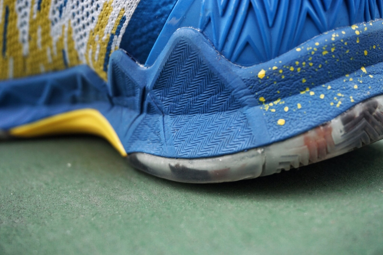 球鞋在配色上根据勇士队的球衣设计,大胆的使用了亮蓝和鲜黄,运用在热熔膜和编织材质的鞋面,使得鞋面配色搭配多元化;