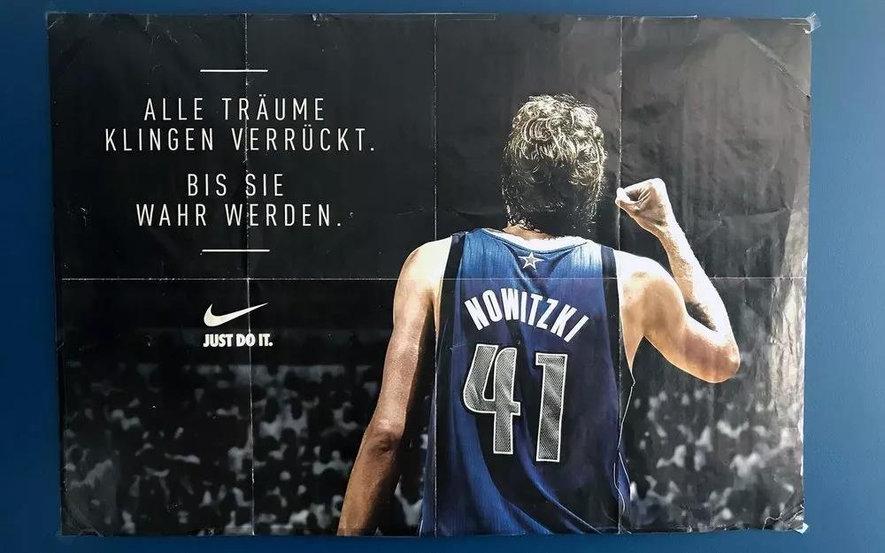 ...在2011年的时候,我就有了这幅海报,在那个赛季,小牛队赢得了NBA总冠军。那年我14岁,从那时起,我知道我要成为一个怎样的球员,以及怎样的一个「人」。是啊,看看这个来自德国的大家伙,他是如何击败了坐拥勒布朗·詹姆斯、德怀恩·韦德、克里斯·波什以及其他精英球员云集的迈阿密热火队?哦,如果要细说的话,那肯定要花掉很多的时间。但是,你知道吗,这是我人生中第一次意识到「胜利」对人们究竟意味着什么。德克成为了我的精神支柱,这张海报也一直陪伴着我...