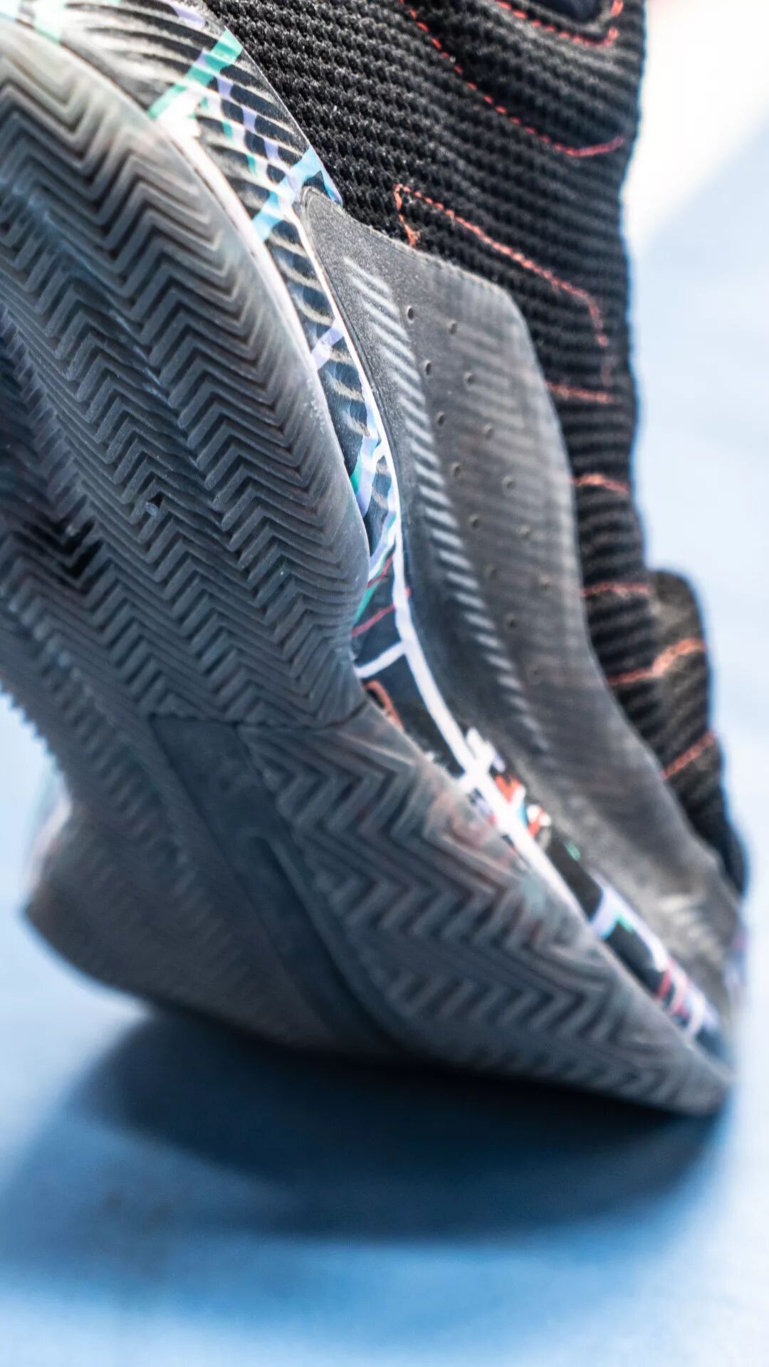 总的来说这项Bounce科技的话偏韧性,然后带一些微弹但是耐久度来说的话跟阿迪同期的Boost是要差那么一些的。最后再来聊这双鞋的抓地和耐磨,目前实战两场来看的话,这双鞋的耐磨程度还是比较不错的,没有出现明显的磨损。