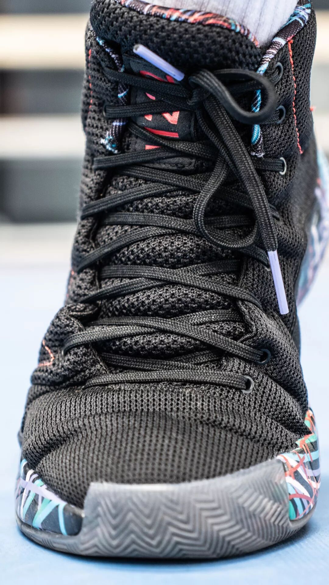 鞋面设计,虽然说造型上来说是一个像Marquee Boost那样的一个设计,但是从鞋面材料的针对性上来看的话,这双鞋我觉得是不太满意的。比如说前掌,随便一褶皱之后这块鞋的鞋面是很难直接回归到原来的状态的。 整个鞋面比较松散,而且没有做针对性的保护,如果你是脚趾有伤的朋友的话,很容易一踩直接踩到你的脚面。